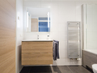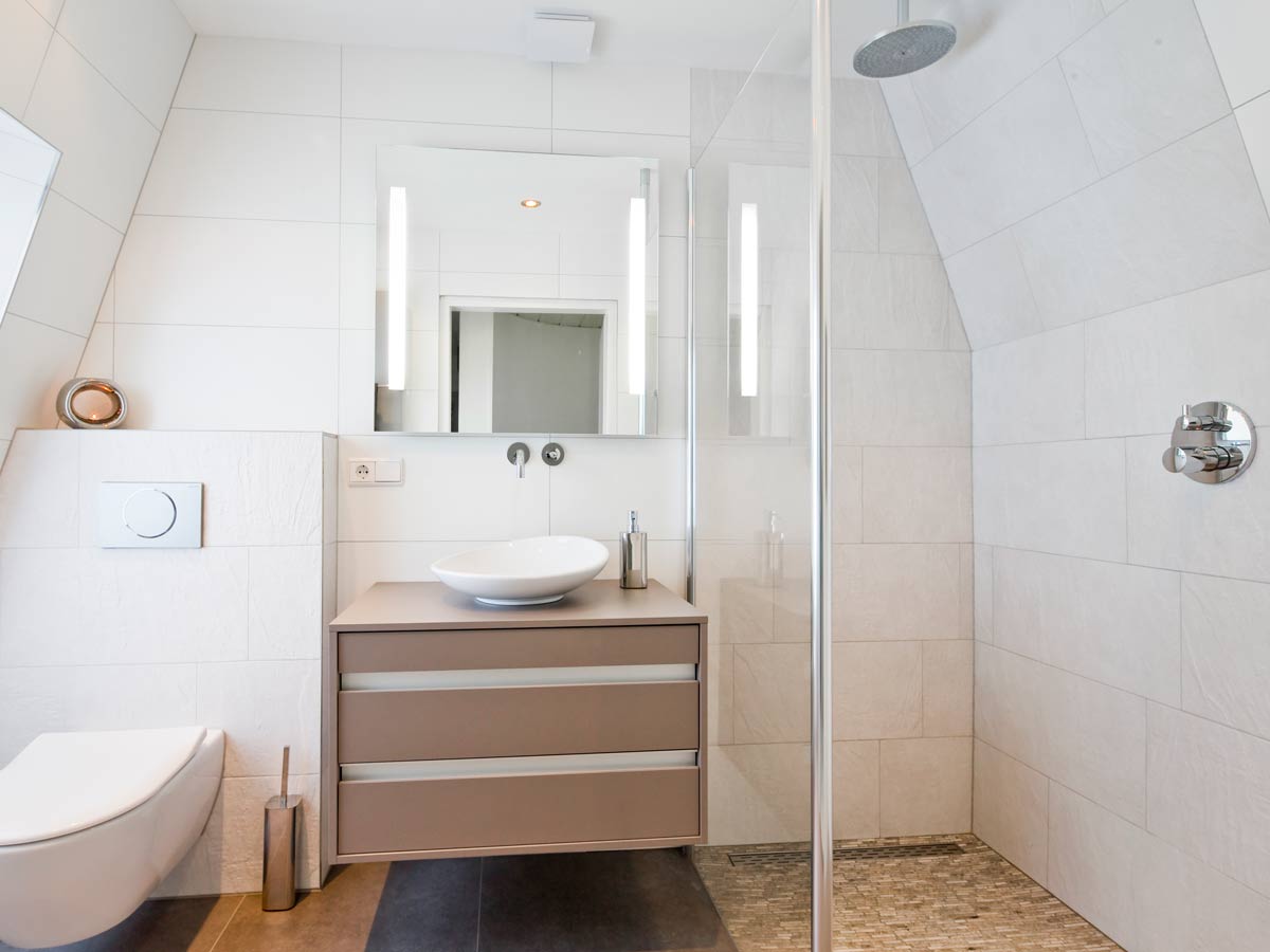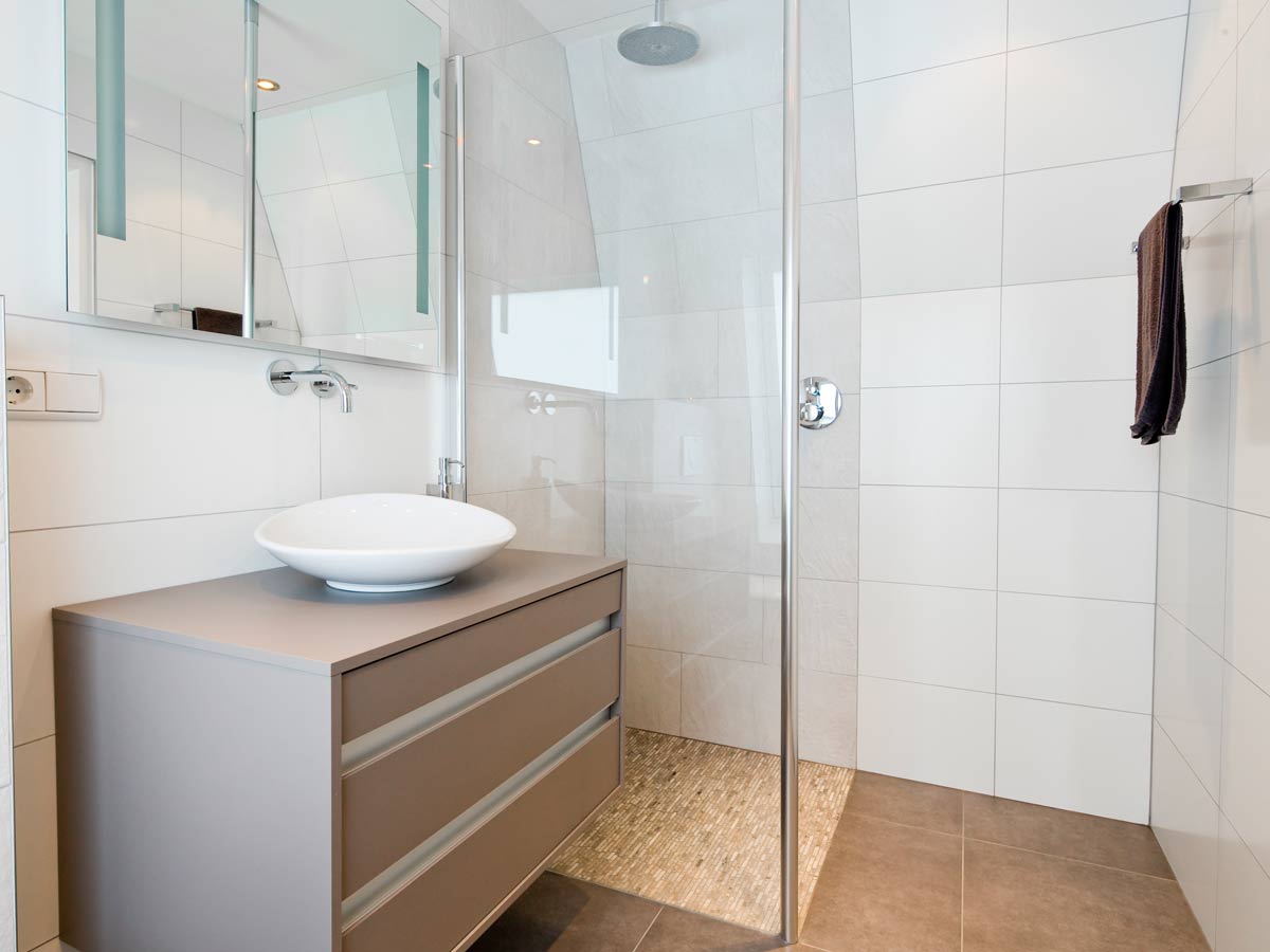In deze badkamer heeft het oude bad plaats gemaakt voor een inloopdouche met douchegoot en regendouche. De douchethermostaat is een zogenaamde inbouwkraan waardoor het geheel minimalistisch oogt. Een strakke glazen wand (veiligheidsglas!) zorgt voor een scheiding tussen douche en wastafelmeubel.