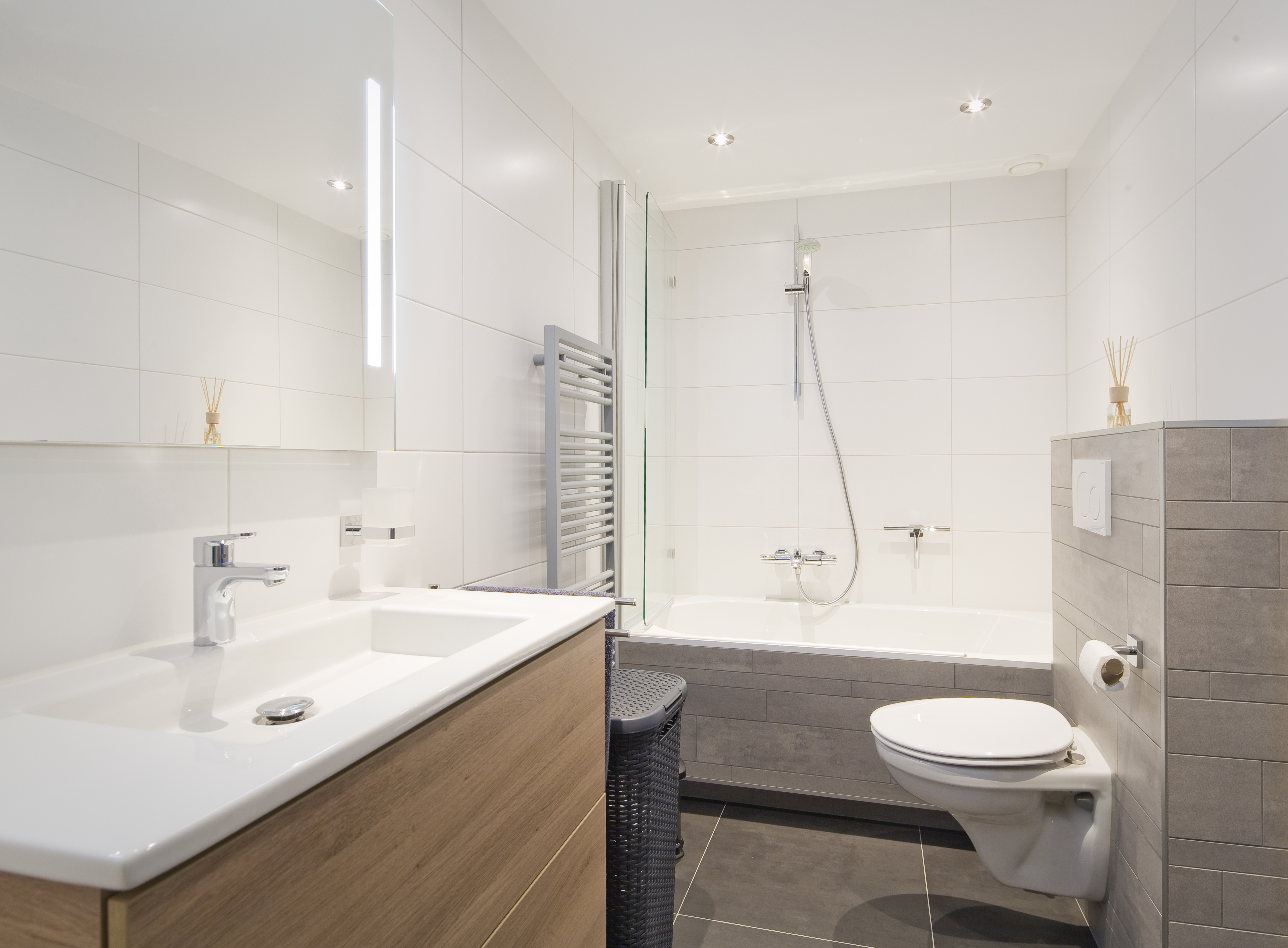 De glazen wand houdt spatwater tegen. De radiator heeft een lichtgrijze tint evenals de tegels aan de voorkant van het bad en het