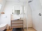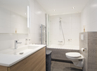 De douche en de wc zijn weggewerkt achter de lichtgrijs betegelde wand. De vierkante vormen komen terug in meubel, kranen en accessoires. Eenheid zorgt voor rust, ideaal om bij te komen na een lange, drukke dag.