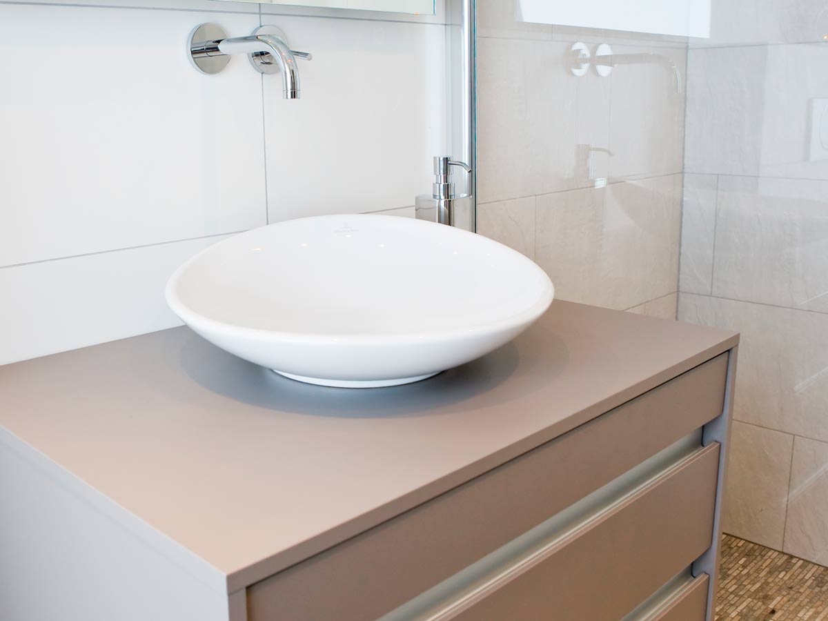 De waskom My Nature van Villeroy & Boch heeft een glooiende rand en staat op een meubel in de kleur basalt mat. Verlichting is geïntegreerd in het glas en dat vergemakkelijkt het schoonmaken van de spiegel. De soft-close-zitting van het wandcloset heeft eenzelfde glooiing als de waskom. Tegels in lichte natuurtinten, combinatie van juiste materialen én met zorg gemonteerd zorgen voor een aangenaam begin en einde van de dag.
